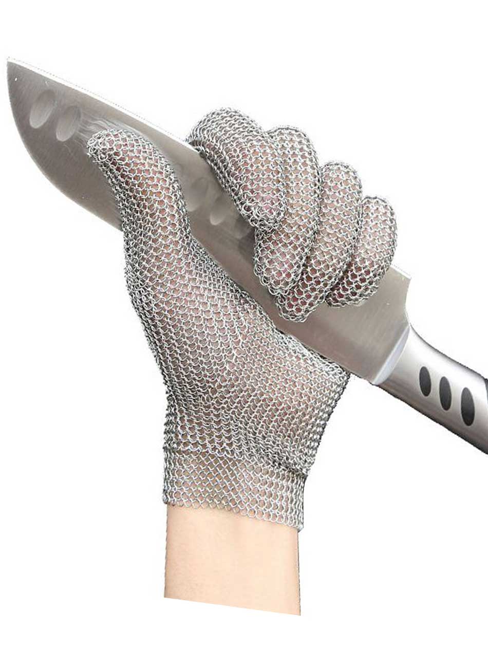Stainless steel metal mesh glove providing complete protection and perfect safety during boning and meat cut-up. High level of puncture resistance, stops knife blades to prevent cuts. Ambidextrous five finger protective glove, easy to put on and remove. Almost as comfortable as a knitted glove, can fit to all morphologies.